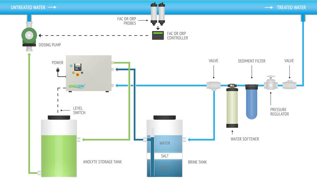 由 Envirolytr(安露來)機型生產的次氯酸電解水先在容器中儲存, 然後與進入的水源混合 (見上文)。流量的管制取決於水源水的水流與其品質, 藉由流量表或自由有效餘氯/氧化還原電位控制器連結的流量幫浦來控制。