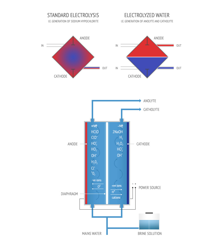 Envirolyte(安露來) 操作原理由 Envirolyte(安露來) 機型生成的電解水 (次氯酸電解水和鹼性電解水)通過管道和反應室輸送, 並由膜分離。這一獨特的專利過程允許更均勻地分配電解質 (鹽水溶液) 在各反應室的容積內, 而減少在停滯區形成的風險, 當電解質的流量高。膈膜電極的構建可以使反應室中進行高效的電化學反應, 並讓化學反應產物得以有效的輸送。